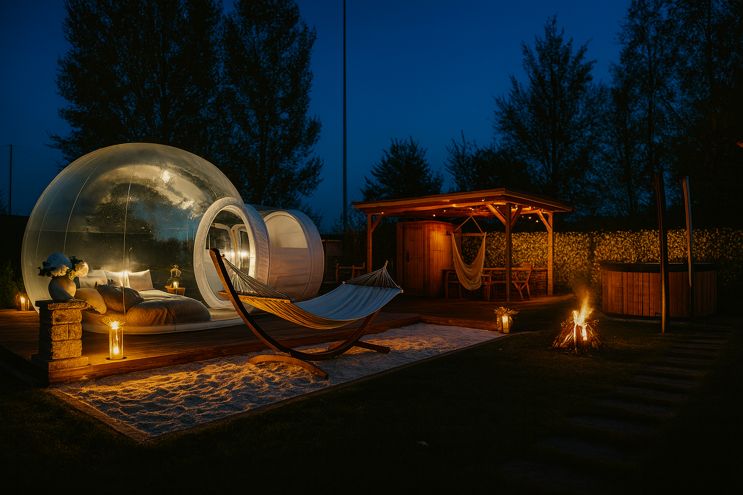 Mit Doppelbett, Terrasse, Hängematte, Whirlpool, Sauna und Feuerstelle bietet das Bubble Tent den perfekten Rahmen für romantische Momente und unvergessliche Auszeiten.
