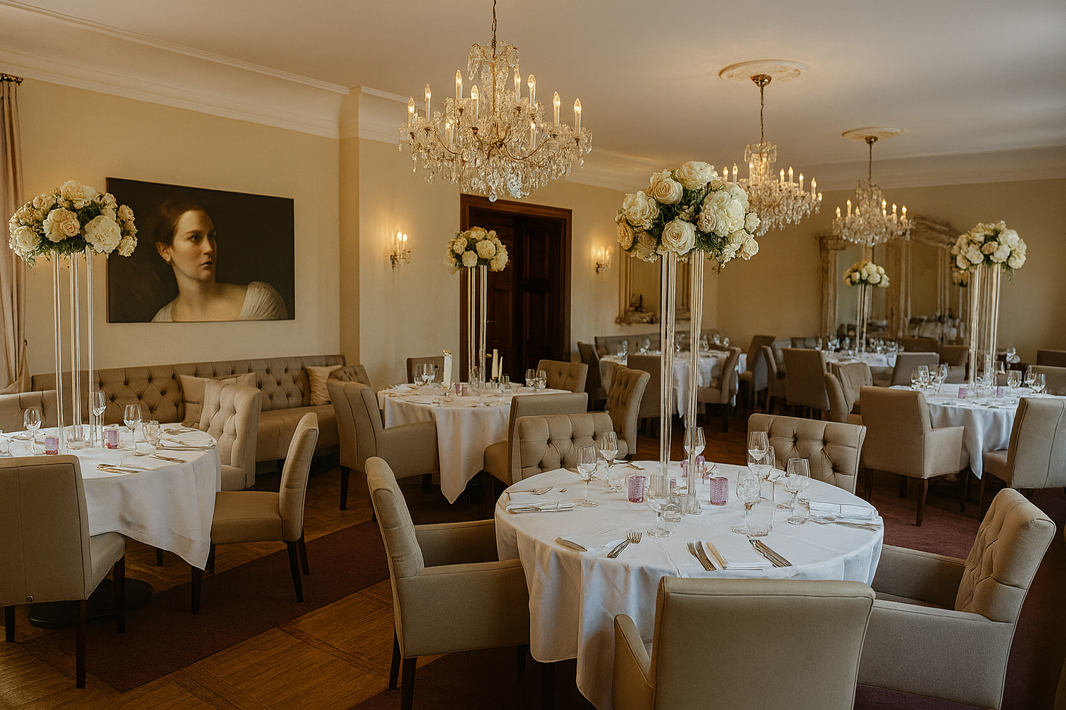 Feiern Sie Ihre Traumhochzeit in den festlichen Räumlichkeiten des Schlosses Krugsdorf. Prunkvolle Säle, edle Kronleuchter und liebevoll gedeckte Tische schaffen den perfekten Rahmen für einen unvergesslichen Tag.